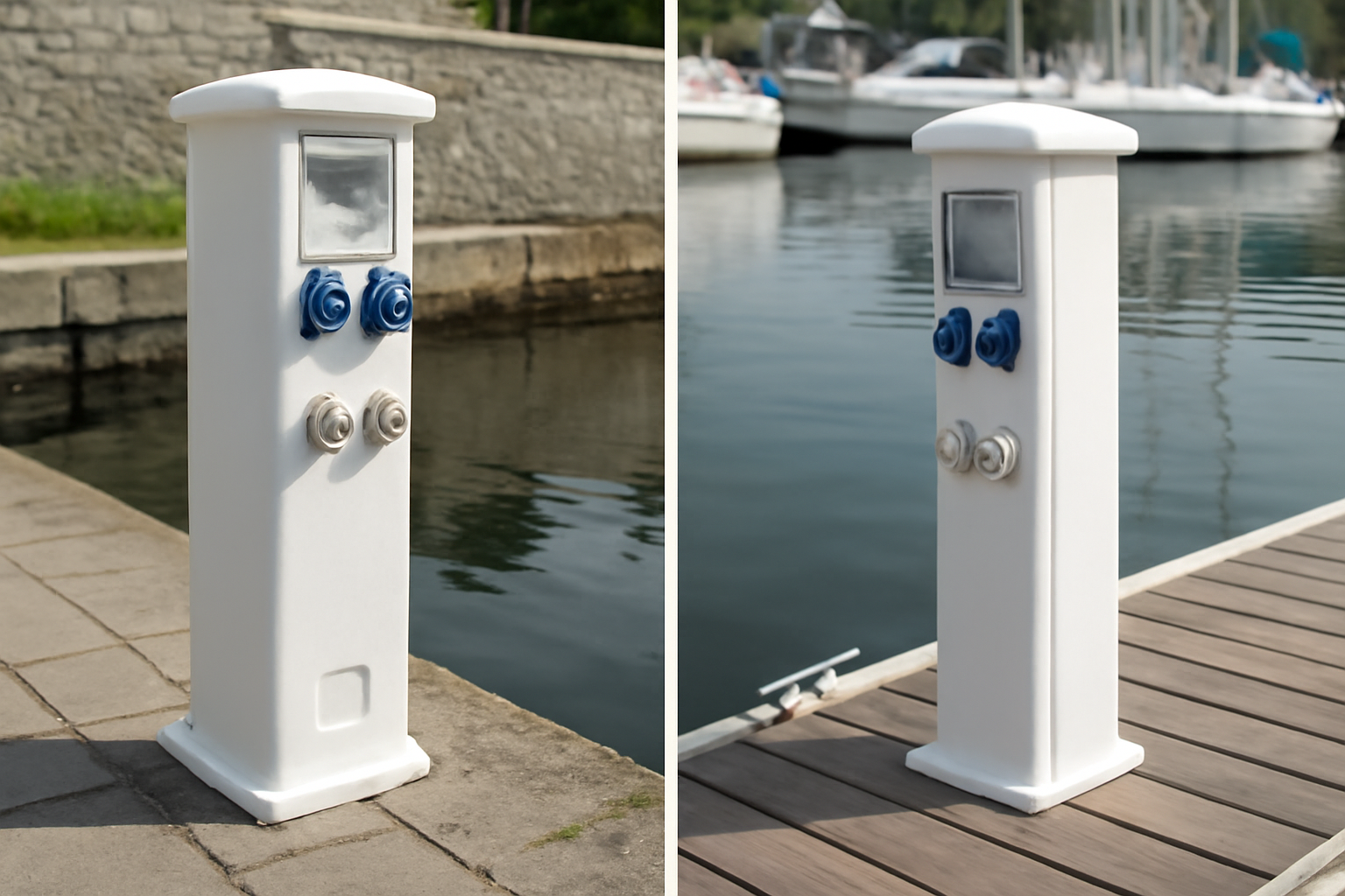 Une borne de quai est généralement installée sur une structure fixe et massive, alors qu’une borne de ponton est prévue pour une installation flottante, exposée aux mouvements, aux chocs et aux variations de niveau d’eau. Les contraintes mécaniques, électriques et environnementales ne sont donc pas les mêmes, ce qui explique des conceptions et des normes parfois différentes.