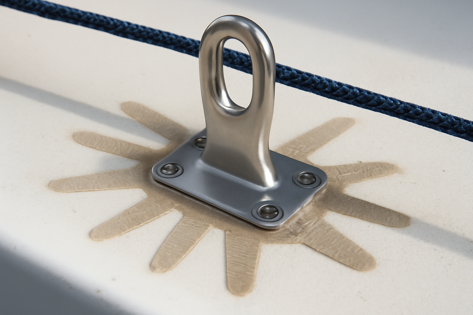 Ces trois efforts combinés expliquent pourquoi une cadène ne doit jamais être fixée uniquement dans le pont, sans reprise sérieuse dans la coque ou la structure interne. La surface de contact doit être suffisante pour diffuser les charges au lieu de les concentrer sur un point unique.