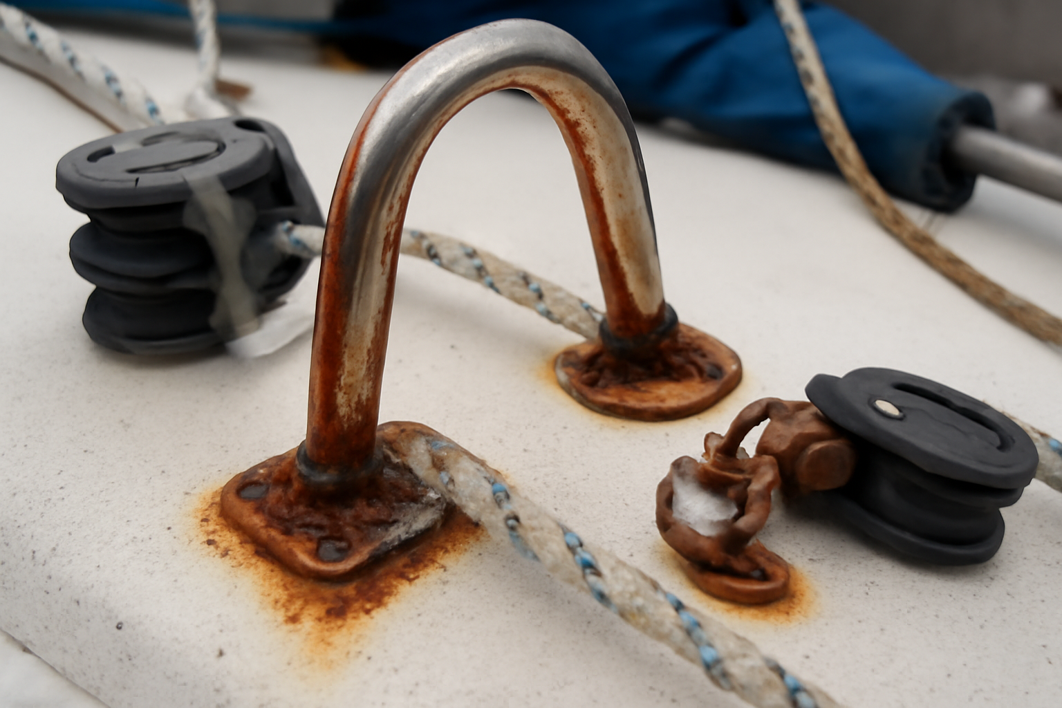 Lorsque la corrosion a entamé la section utile d’une pièce, la résistance chute fortement. Même si la pièce semble encore fonctionnelle, un remplacement préventif s’impose, en particulier sur tout ce qui participe au maintien du mât ou des charges importantes.