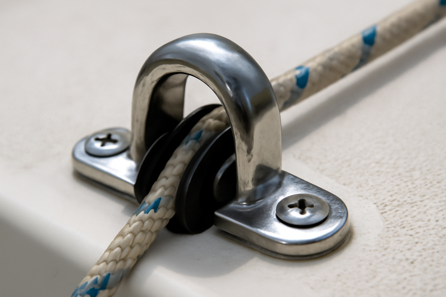 Un pontet est une pièce métallique ou composite, généralement en forme d’arceau ou de boucle, que l’on boulonne ou visse sur le pont. La poulie vient se connecter sur ce point fixe pour dévier ou renvoyer un cordage avec un angle de travail défini. Un mauvais choix de pontet peut entraîner une usure accélérée de la poulie, un arrachement du pont ou encore des contraintes dangereuses sur le gréement.
