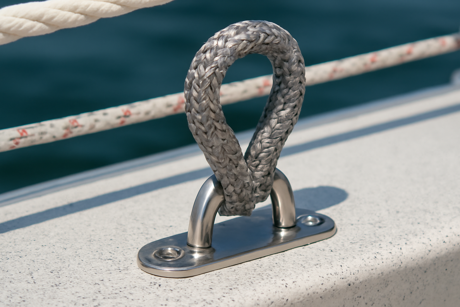 Concrètement, il s’agit d’une boucle ou d’un cordage en Dyneema, parfois gainé, fixé sur le pont ou la structure du bateau pour créer un point d’ancrage fiable pour poulies, retenues, palans ou lignes de sécurité. Une cadène Dyneema peut être montée directement sur un rail, un pontet, une cloison ou un renfort structurel.